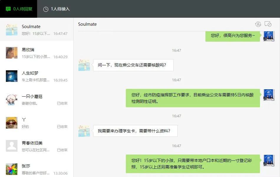 8月份升級開通網(wǎng)絡(luò)人工客服,市民通過荊門公交微信公眾號,與人工客服1號、2號坐席進(jìn)行溝通,建立起集咨詢、尋物、建議、投訴等一體化的綜合在線服務(wù)。