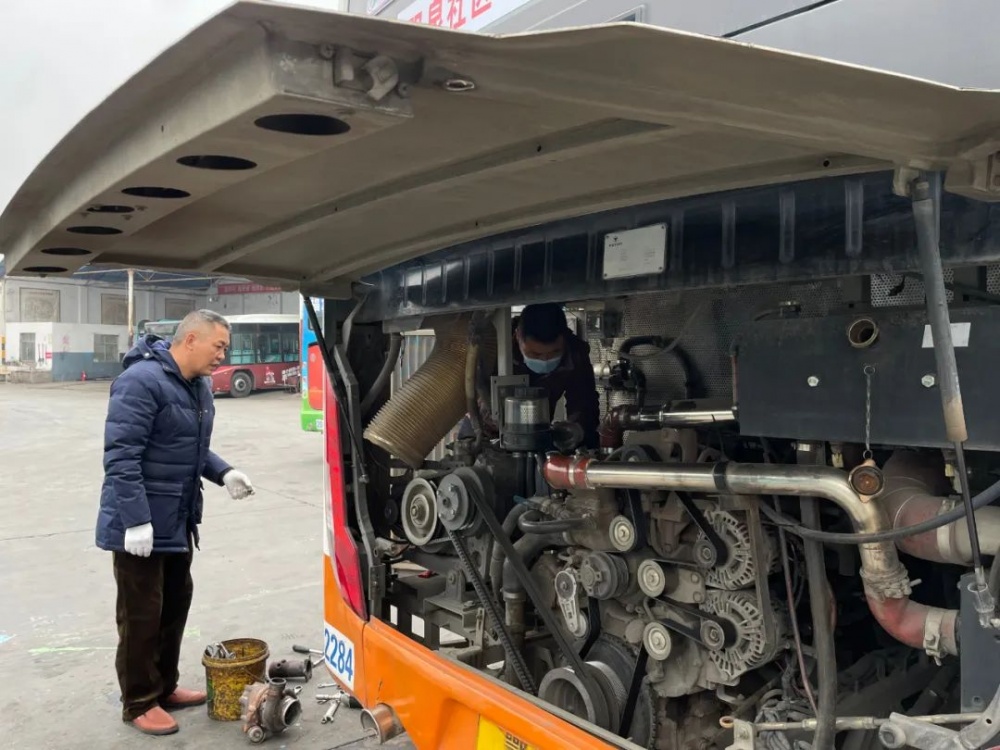 4點30分,魏全兵到達公司停車場,對“老搭檔”進行車身、燈光、胎壓、機油等每個項目例行檢查,考慮到過節(jié)比平常更要注重安全,他又反復(fù)巡檢確認(rèn),這才放心啟動車輛。他運營的這趟班是公司值班車(接送首班車的駕駛員、后勤人員),從雙泉小學(xué)到東寶停保場,將沿路的同事一一接上,送往目的地后,他再開始一天的營運工作。