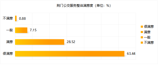 本次調(diào)查共收集有效問卷1471份,623條相關(guān)問題及建議。問卷涵蓋公交線網(wǎng)優(yōu)化、文明服務(wù)、換乘便捷度、候車時間、乘車舒適度、智能信息建設(shè)等多方面內(nèi)容。調(diào)查顯示,參與投票人群年齡結(jié)構(gòu)主要集中在18~59歲,其中以40~59歲為主體。(一)公交服務(wù)滿意度指標(biāo)及數(shù)值根據(jù)交通運(yùn)輸部GB/T 36953.2-2018城市公共交通乘客滿意度評價方法,公共交通乘客滿意度指乘客對公共交通服務(wù)質(zhì)量的滿意程度,評價程度設(shè)置為“很滿意”、“滿意”、“一般”與“不滿意”。問卷顯示荊門公交服務(wù)整體滿意度為91.96%。問卷顯示公交線網(wǎng)分布不均、線路不合理、換乘不便捷為主要服務(wù)訴求,公交線路分布不均為“不滿意度”投票最高問題;主干道公交優(yōu)先通行權(quán)為服務(wù)訴求投票最高關(guān)注點。 此次問卷調(diào)查,感謝廣大市民乘客的積極參與,市公交集團(tuán)將結(jié)合實際,認(rèn)真聽取、采納乘客提出的意見及建議,予以改進(jìn): 關(guān)于線路運(yùn)營方面,對5路線(圣境山—海慧)、88路線(東寶碧桂園—楊家橋)、58路線(碧桂園北—漳河新區(qū)政務(wù)中心)、59路線(荊楚理工學(xué)院—掇刀區(qū)政務(wù)中心)早中晚客流高峰期加密營運(yùn)班次和增設(shè)區(qū)間班次,對33路線(楚天學(xué)?!d化三路東)、69路線(雙喜小學(xué)—園博園東門)、13路線(牌樓—園博園西門)進(jìn)行線路優(yōu)化,方便沿線居民出行需求;近期擬開通碧桂園翡翠公館至長崗萬人社區(qū)、東寶政務(wù)中心至市政務(wù)中心公交線路,具體方案正逐步規(guī)劃中。