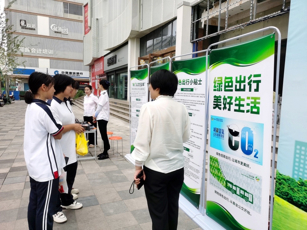 “綠色出行 美好生活”主題宣傳背景墻和公交出行宣展板,展示了荊門公交企業(yè)文化、便民舉措、綠色發(fā)展、服務(wù)提質(zhì)等內(nèi)容,引導(dǎo)廣大市民了解和支持公共交通發(fā)展。
