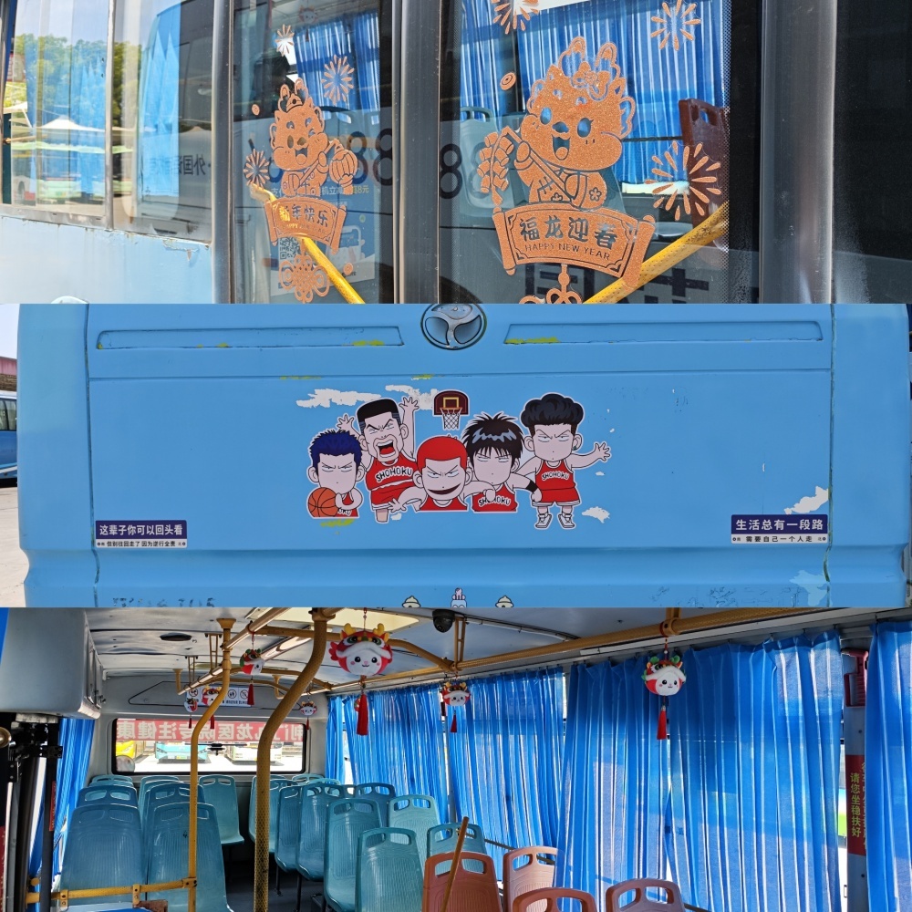 2020#車還有另外幾處細(xì)節(jié),引起小編注意,上下車門處貼有卡通人物和“福龍迎春”貼紙,車尾部貼有“灌籃高手”人物貼紙和提示標(biāo)語,車廂內(nèi)的扶手桿則掛滿了喜慶娃娃??吹竭@些裝飾和布置,仿佛感受到了駕駛員的熱情、認(rèn)真和細(xì)膩。