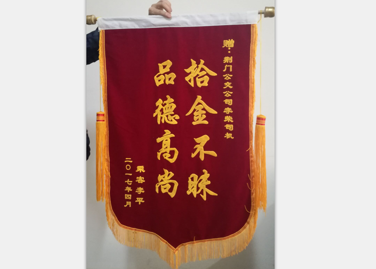 2017年4月4日上午九點左右,一名乘客由于粗心大意,不慎將一個包包遺留在公交車內(nèi),包包內(nèi)裝有蘋果平板電腦一個、手機一部、金銀手飾一包、銀行卡數(shù)張、身份證、現(xiàn)金若干.......二公司三路車159#駕駛員李榮在到達(dá)運動公園始發(fā)站打掃衛(wèi)生時發(fā)現(xiàn)了一個紅色包包,該駕駛員立馬與隊長取得聯(lián)系、剛好隊長和站務(wù)在始發(fā)站,駕駛員李榮親自將包交給了隊長,并說明原由,并在眾人下隊長打開了包包,發(fā)現(xiàn)里面的都是貴重物品。不久,失主打包內(nèi)的電話來詢問此事,隊長認(rèn)真做了回復(fù),告之為保證物品安全,要攜帶證明按程序認(rèn)領(lǐng)。當(dāng)天下午失主李女土從公司支部書記手中認(rèn)領(lǐng)失物。昨日送來錦旗一面。