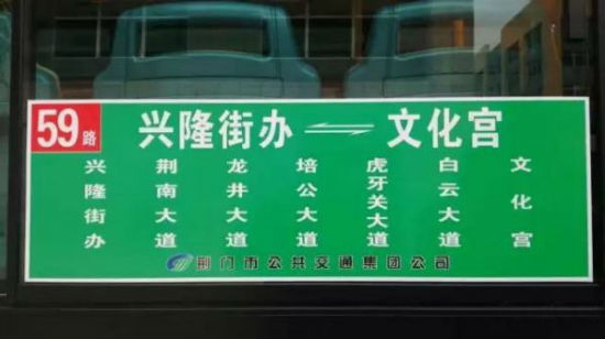 59路起于興隆街辦,止于荊門工人文化宮,全線共行駛興隆街辦、荊南大道、龍井大道、培公大道、虎牙關大道、白云大道、文化宮等主要線、點,覆蓋高新區(qū)東片區(qū)的國昊文化、華工科技等主要企業(yè),連接九派通眾創(chuàng)園、區(qū)政府、十里牌、天鵝湖、中心客運站等。早班為6:36分發(fā)班,晚上18點收班。計劃投入公交車20輛,首批投入6輛試運行。至1月20日后正式運行。
