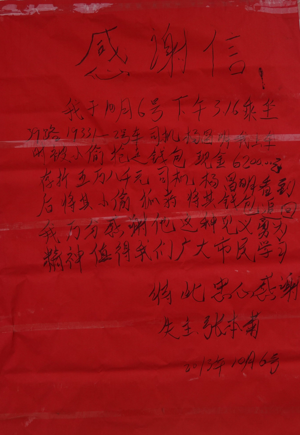 就在大家為這名錢包被偷的女子惋惜時,一名穿紅色T恤、黑色褲子的男子趁亂穿過馬路匆匆離開,坐在后排的一位乘客再也忍不住,大喊起來:"我看到就是他偷的!"此時,紅T恤男子已經(jīng)朝金龍泉大道啤酒廠方向走去。司機(jī)楊昌明見狀,立即開門,跳下駕駛室邊追邊大喊"站住"。聽到喊聲,紅T恤男子撒腿就跑,楊昌明和兩名熱心乘客緊跟著追去。眼見楊昌明和兩名熱心乘客越追越近,紅T恤男子將一個紅色錢包丟在了地上,楊昌明將錢包撿起后沒再追趕。當(dāng)楊昌明返回車上,女失主卻已經(jīng)不見了,在一車乘客的見證下,楊昌明打開錢包,發(fā)現(xiàn)錢包內(nèi)有6200元現(xiàn)金和一些存款單。為了不耽誤車上的乘客出行,楊昌明暫時將錢包保管,驅(qū)車離開。