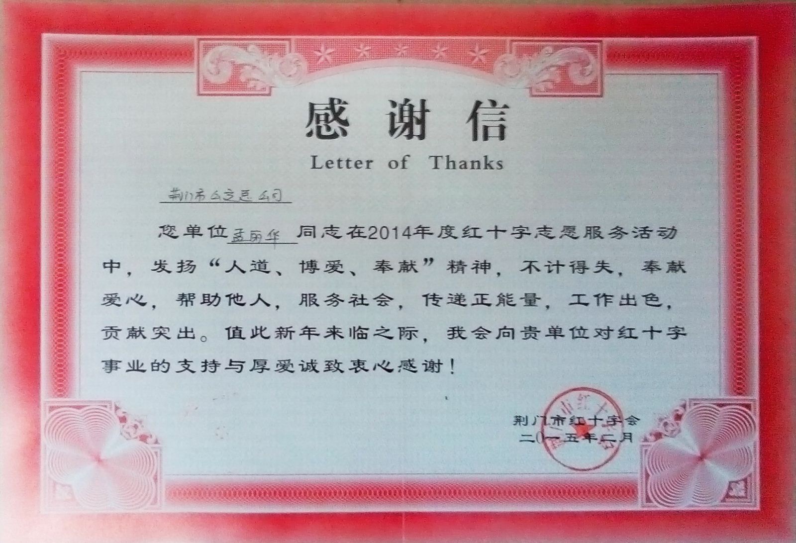 近日,集團(tuán)公司收到一封來自市紅十字會對荊門公交職工孟麗華的感謝信,內(nèi)容為孟麗華同志在2014年度紅十字志愿服務(wù)活動中,發(fā)揚“人道、博愛、奉獻(xiàn)”精神,不計得失,奉獻(xiàn)愛心,幫助他人,服務(wù)社會,傳遞正能量,工作出色,貢獻(xiàn)突出。