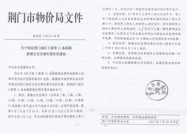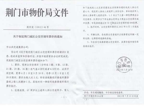根據(jù)荊門市物價(jià)局《關(guān)于制定荊門城區(qū)公交空調(diào)車票價(jià)的通知》(荊價(jià)發(fā)[2013]46號(hào))及《關(guān)于制定荊門城區(qū)2路等11條線路新增公交空調(diào)車票價(jià)的通知》(荊價(jià)發(fā)[2013]48號(hào)),公交空調(diào)車2014年6月1日至9月30日營運(yùn)時(shí)段內(nèi)執(zhí)行2元/人次票價(jià),現(xiàn)就執(zhí)行公交空調(diào)車票價(jià)后的有關(guān)事項(xiàng)公告如下: