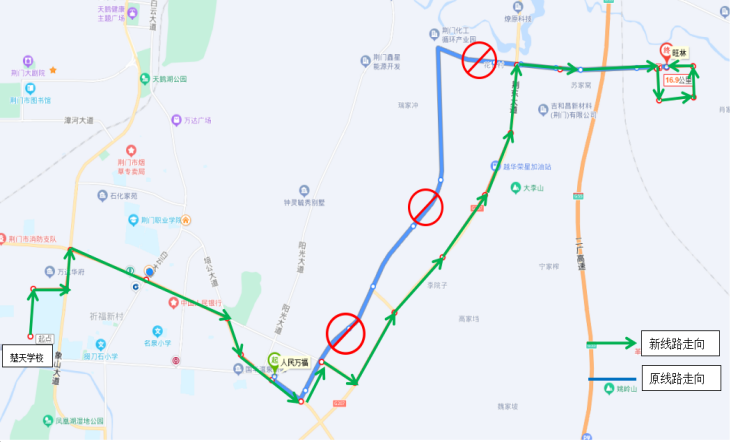 一.優(yōu)化調(diào)整33路公交線路走向 ◆首末站:楚天學(xué)?!郑ㄐ】的下繁保?/p> ◆首末班時(shí)間:6:50—17:45 ◆線路走向:響嶺路—運(yùn)動(dòng)公園路—象山大道—深圳大道—培公大道—荊和大道—深圳大道—荊東大道—興化三路—格林北路—興化四路—小康南路 ◆??空军c(diǎn):楚天學(xué)校、雙喜街辦、運(yùn)動(dòng)公園路、萬(wàn)達(dá)廣場(chǎng)、掇刀檢察院、掇刀法院、掇刀公安分局、南城明珠、中國(guó)人民銀行、市氣象局、襄荊高速、雙泉社區(qū)、人民萬(wàn)福商貿(mào)城、人民一品花園、虎頭山、殯儀館、馮廟村、固潤(rùn)科技、東方雨虹、圣通石化、荊東消防、荊東大道興化五路口、潤(rùn)都制藥、興化三路西、興化三路中、興化三路盈德氣體、紐蘇萊、旺林、興化四路、小康南路北。 ◆取消原33路途經(jīng)荊和大道等路段站點(diǎn):荊和大道南、陽(yáng)光五路、陽(yáng)光四路、陽(yáng)光三路、化工產(chǎn)業(yè)園行政大樓。 二.優(yōu)化調(diào)整69路公交發(fā)班時(shí)間 ◆調(diào)整前 園博園東門(mén)發(fā)班時(shí)間:6:40、7:40、15:30、16:30、17:15 玲瓏輪胎發(fā)班時(shí)間:7:30、8:30、16:30、17:30、18:00 ◆調(diào)整后 園博園東門(mén)發(fā)班時(shí)間:6:40、7:20、15:30、16:30 玲瓏輪胎發(fā)班時(shí)間:7:30、8:20、12:20、16:20、17:30